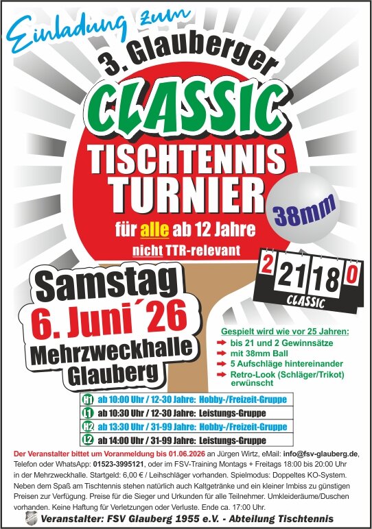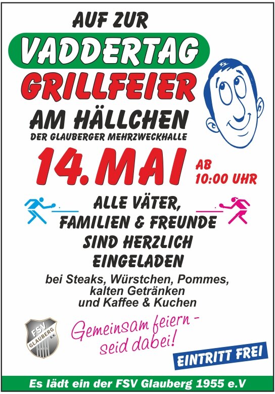 Donnerstag, 14. MAI 2026 VADDERTAGS-GRILLFEIER AM HÄLLCHEN + + + Samstag, 6. Juni 2026 > 3. Glauberger CLASSIC TISCHTENNIS-Turnier Online-Anmeldung hier + + + DART-Fieber in Glauberg: erfolgreiche Turnierpremiere beim FSV Glauberg + + + Freitag, 26. Juni 2026 - 19:30h - Tischtennis-Kreistag Wetteraukreis Mehrzweckhalle Glauberg + + +
